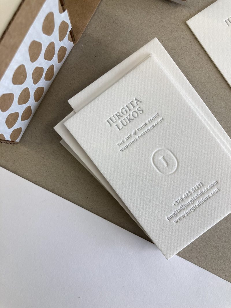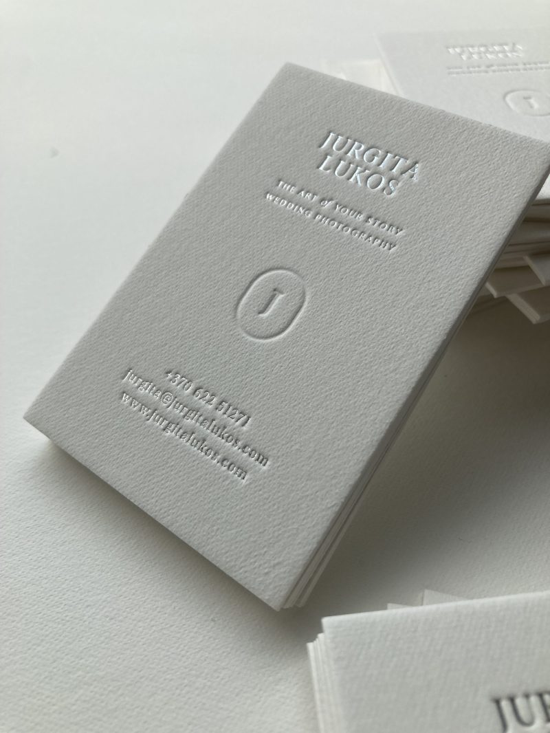 Vizitinių kortelių gamybai be karšto folijavimo sidabro folija taip pat panaudotas ir blind deboss (tuščias įspaudas).