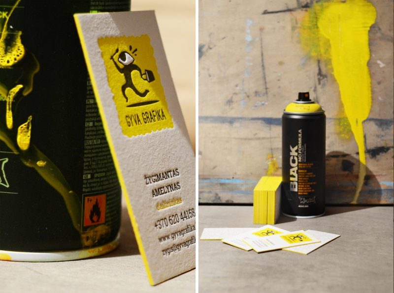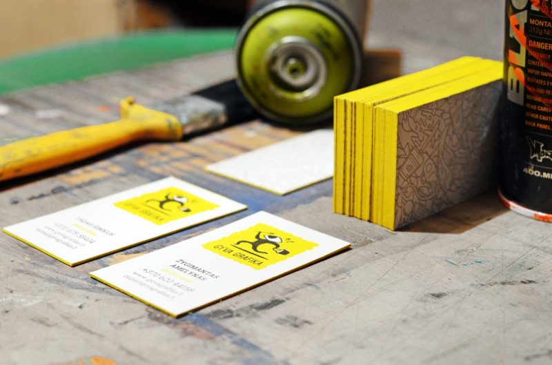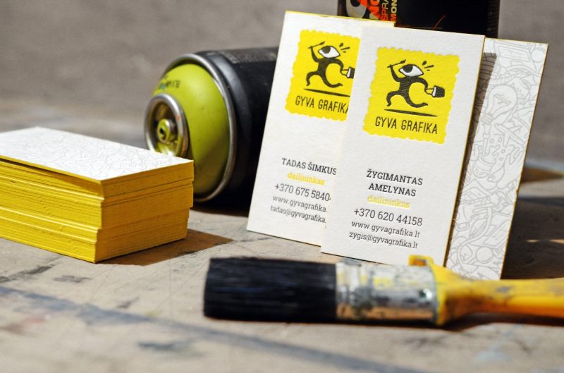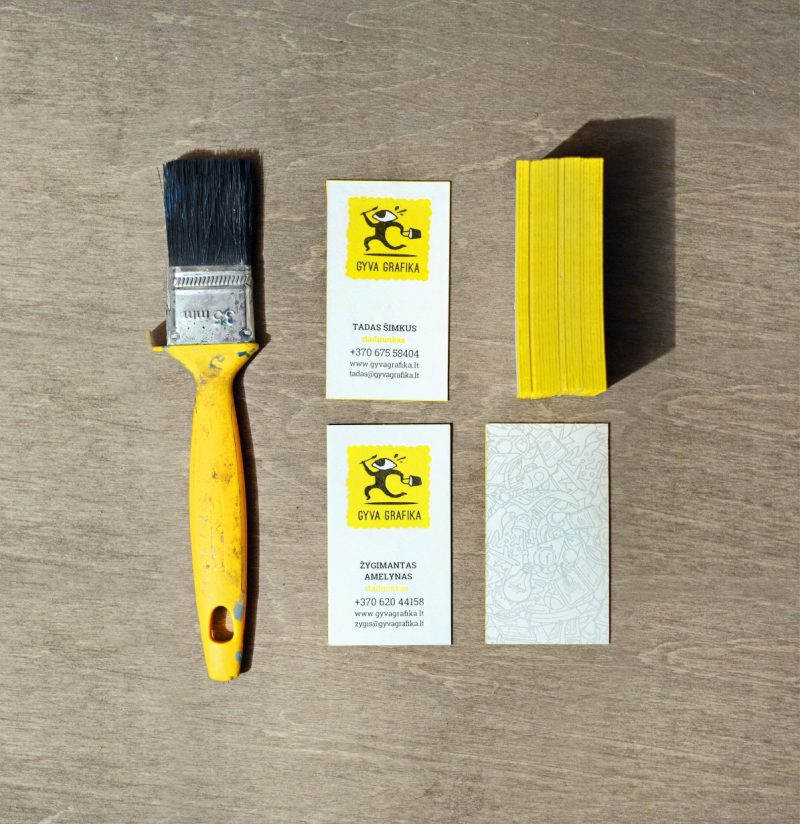 Gyva Grafika dabar tapo dar gyvesnė! Vizitinėms kortelėms naudota dvipusė spauda su geltonai dažytu krašteliu.