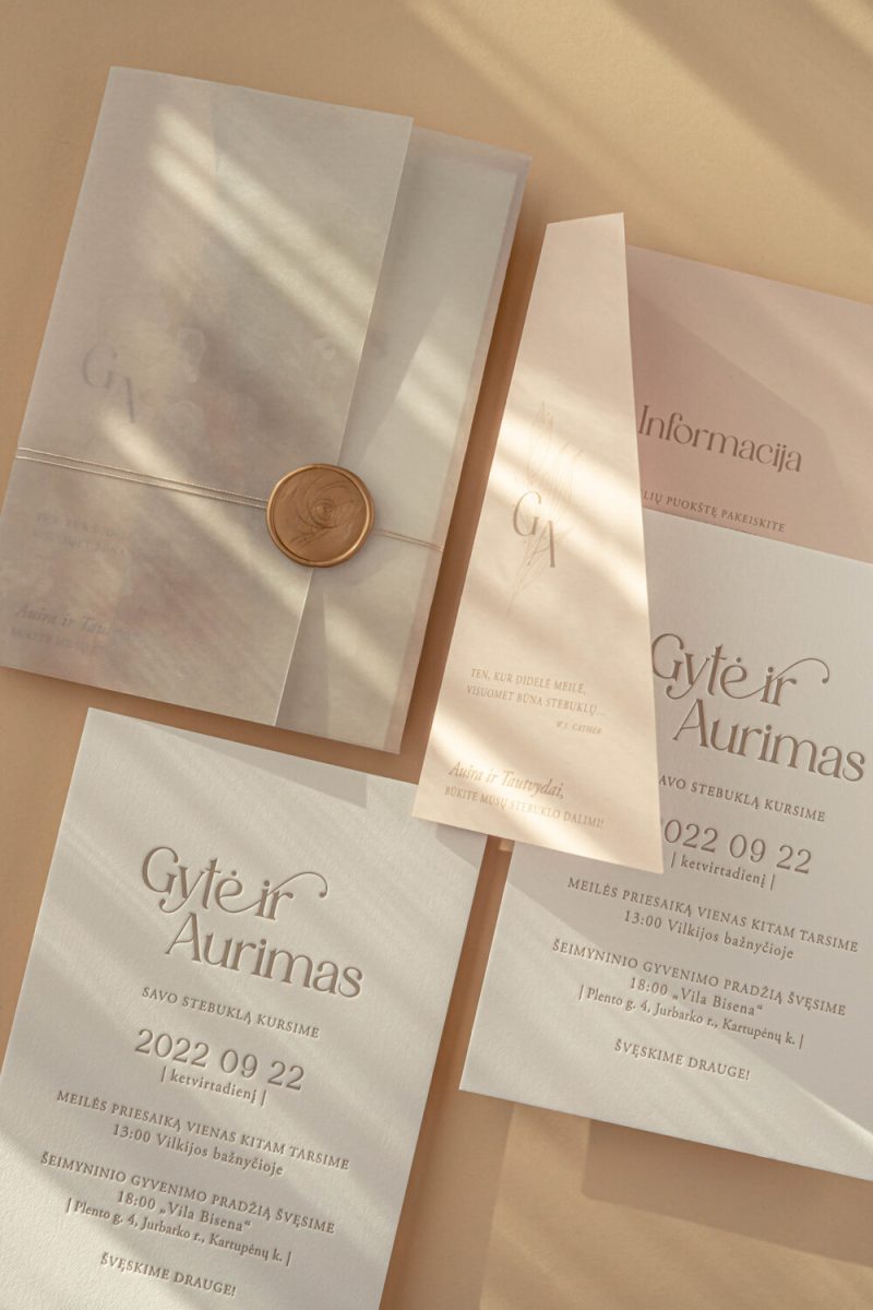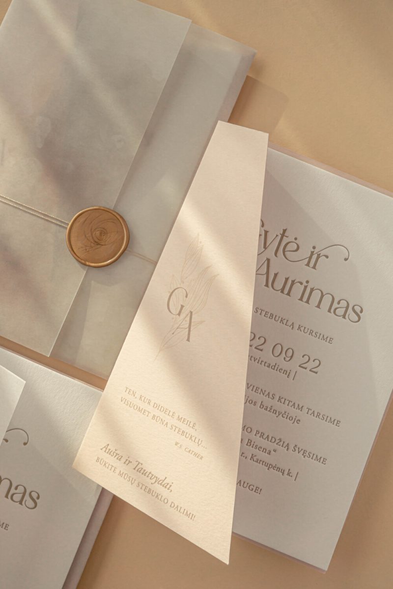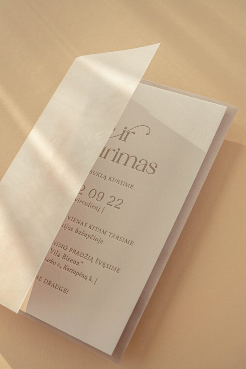 Šie subtilūs vestuvių kvietimai – tai elegantiškumo ir kokybės derinys. Pagaminti iš aukštos kokybės popieriaus su prabangiais spaudos elementais, jie sukuria išskirtinę patirtį. Kvietimų gamybai pasirinktas žemiškos spalvos teksto dažas.